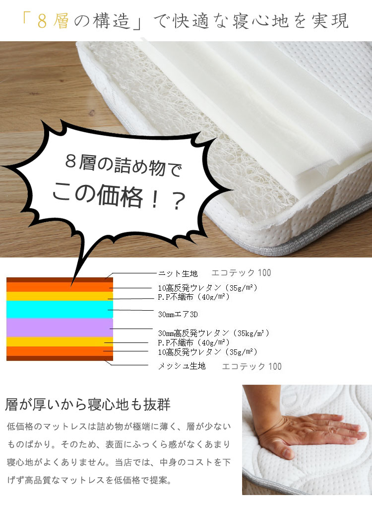 また、コンパクト2段ベット用(二段ベット、ロフトベット、ミドルベット、3段ベット、三段ベット、親子ベット)に使えるスモールシングル(セミシングル)サイズもございます ベッドや畳、和式用に対応!まとめ買い、民宿用、民泊用、宿泊用、旅館用、宿舎用、寮用、社宅用、社員寮用、ホテル用、シェアハウス用、ビジネスホテル用、施設用などのマットレスの買い替えなど大口注文も通販で承ります!ご希望の方は、こちらのページに!【6枚以上ご希望の場合はメールでお問合せ下さい】【受注生産40〜70日前後】 ■家具用語では。